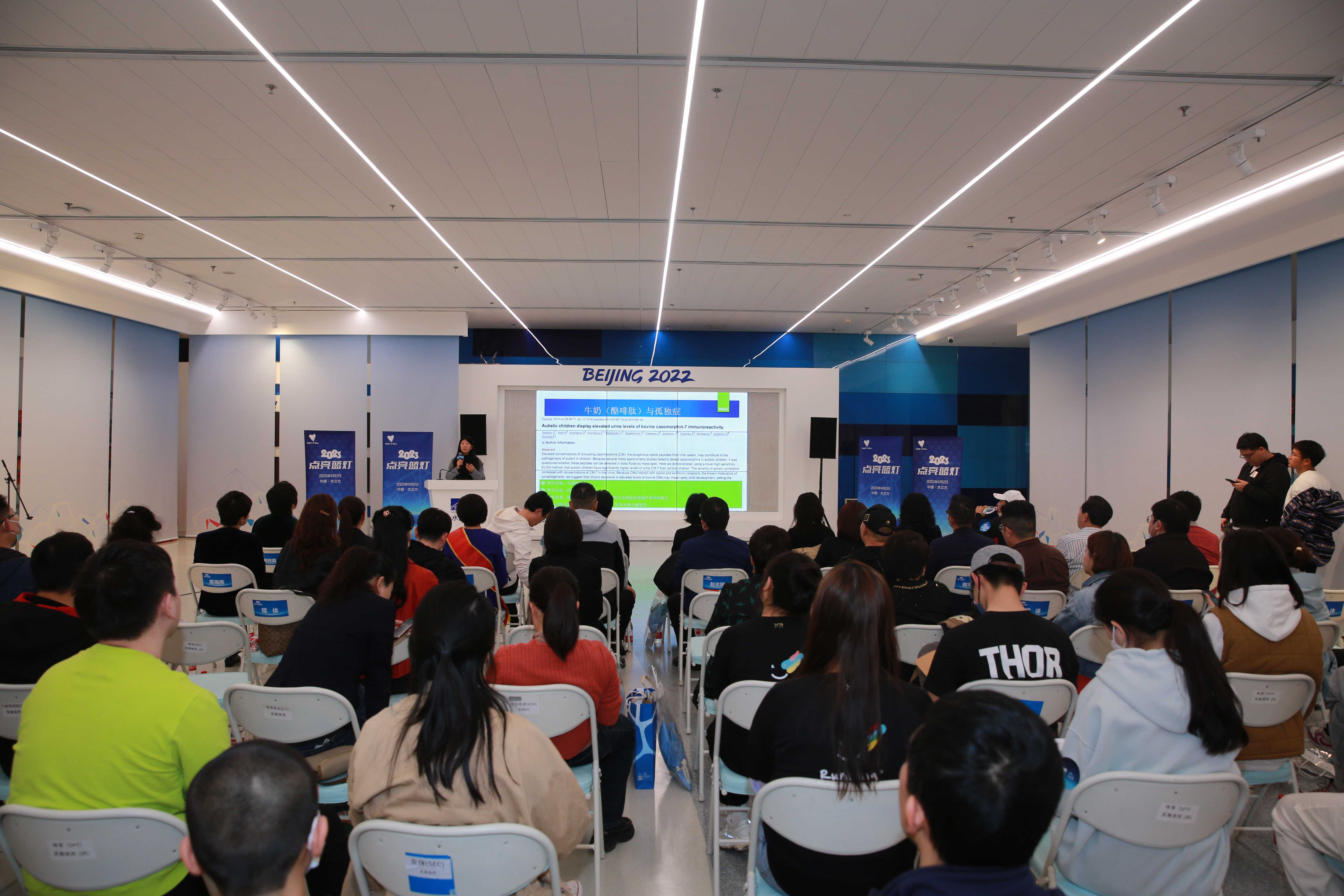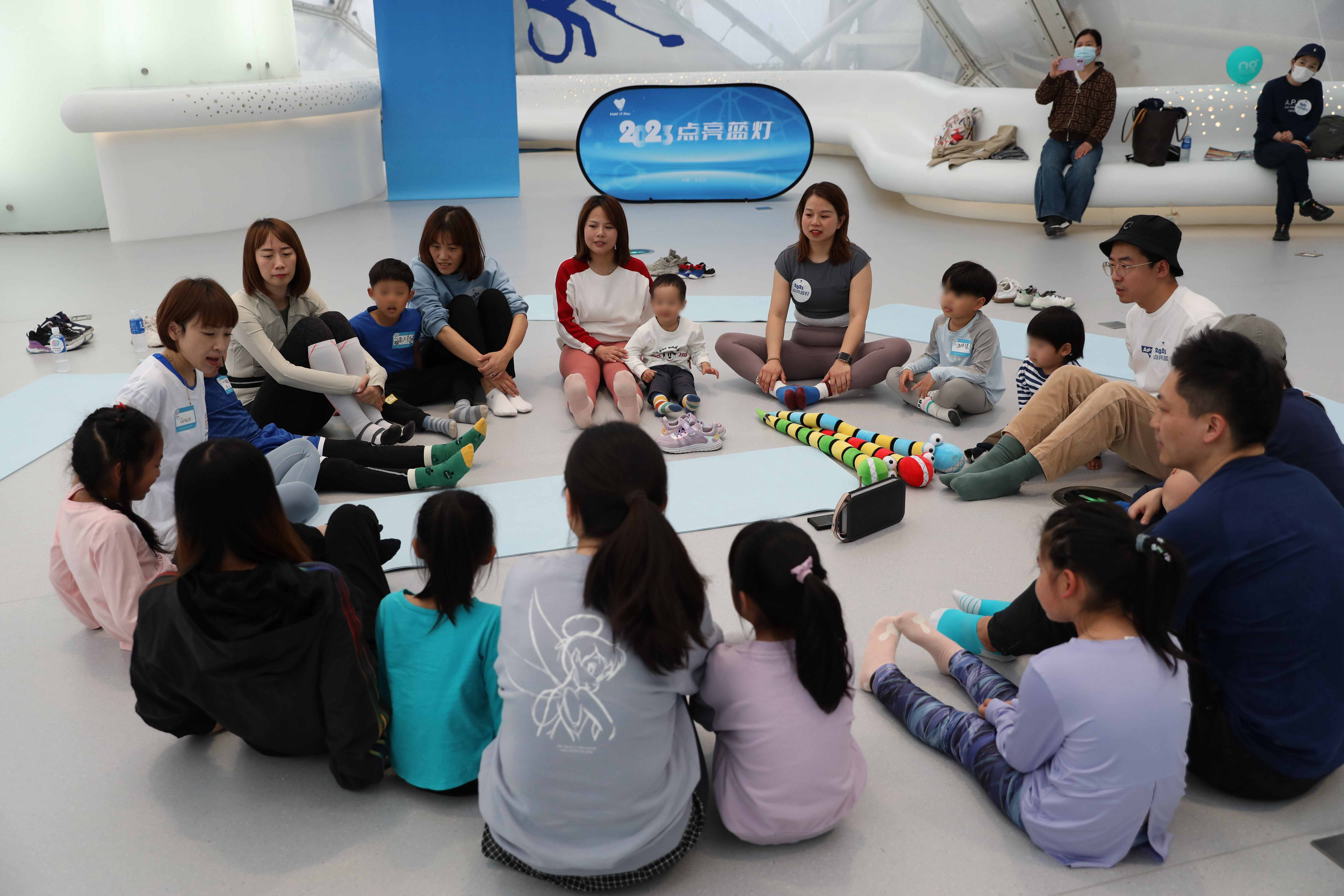 People participate in group exchange sessions during the annual "Light it Blue" event at the National Aquatics Center in Beijing, April 2, 2023. [Photo provided to China.org.cn]