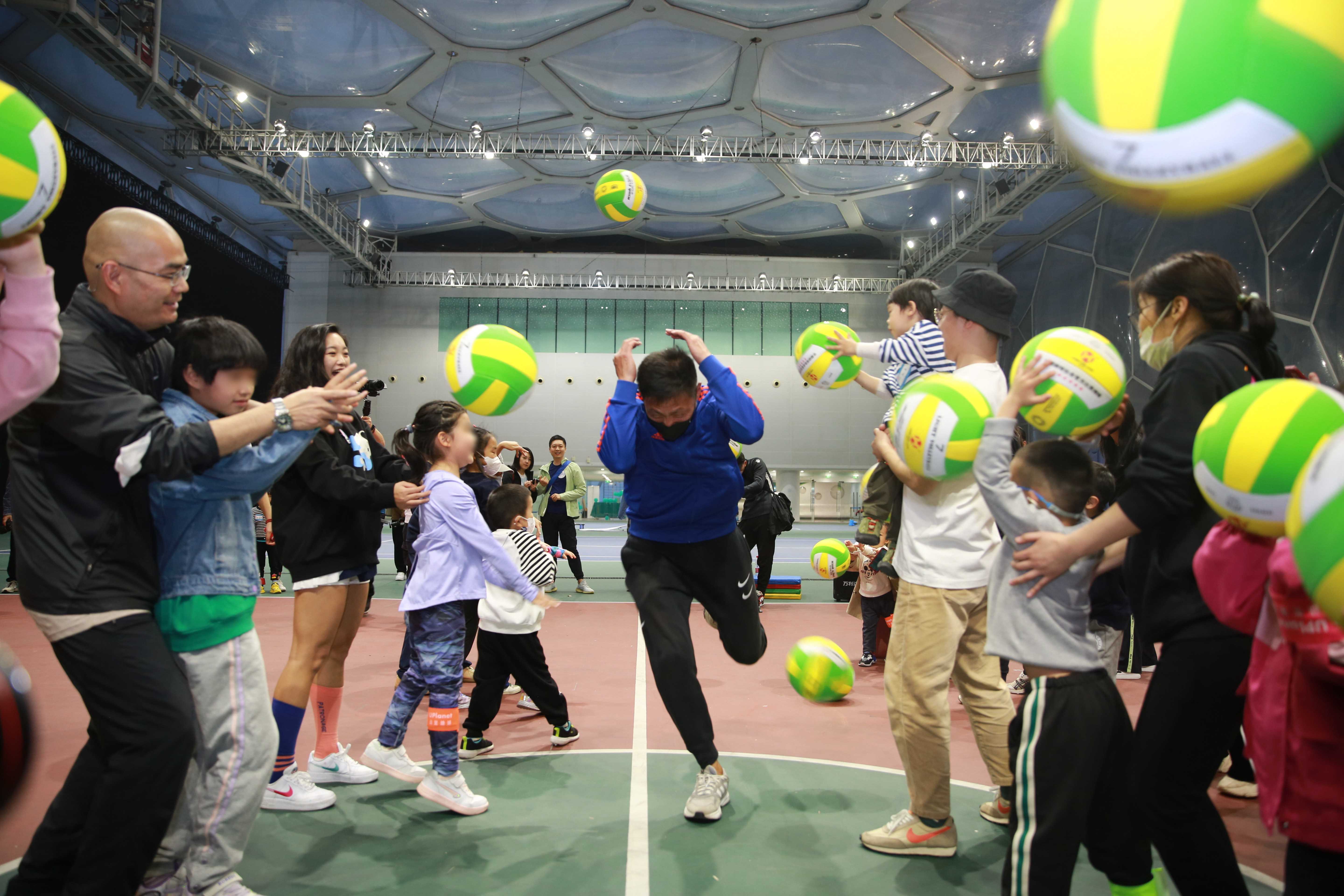Children and their families play sports at the National Aquatics Center in Beijing, April 2, 2023. [Photo by Wu Xiaoshan/China.org.cn]