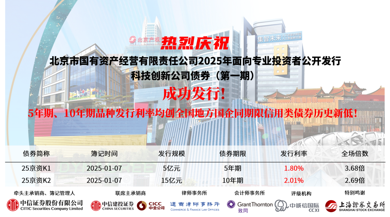 本期科技创新公司债券的发行,采用双期限互拨形式,其中,25京资K1发行规模5亿元,期限5年,票面利率1.80%;25京资K2发行规模15亿元,期限10年,票面利率2.01%。双品种发行利率均创全国地方国企同期限信用类债券历史新低,实现2025年融资工作开门红。