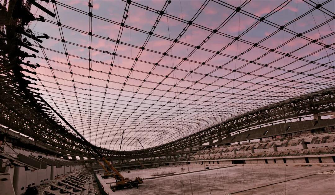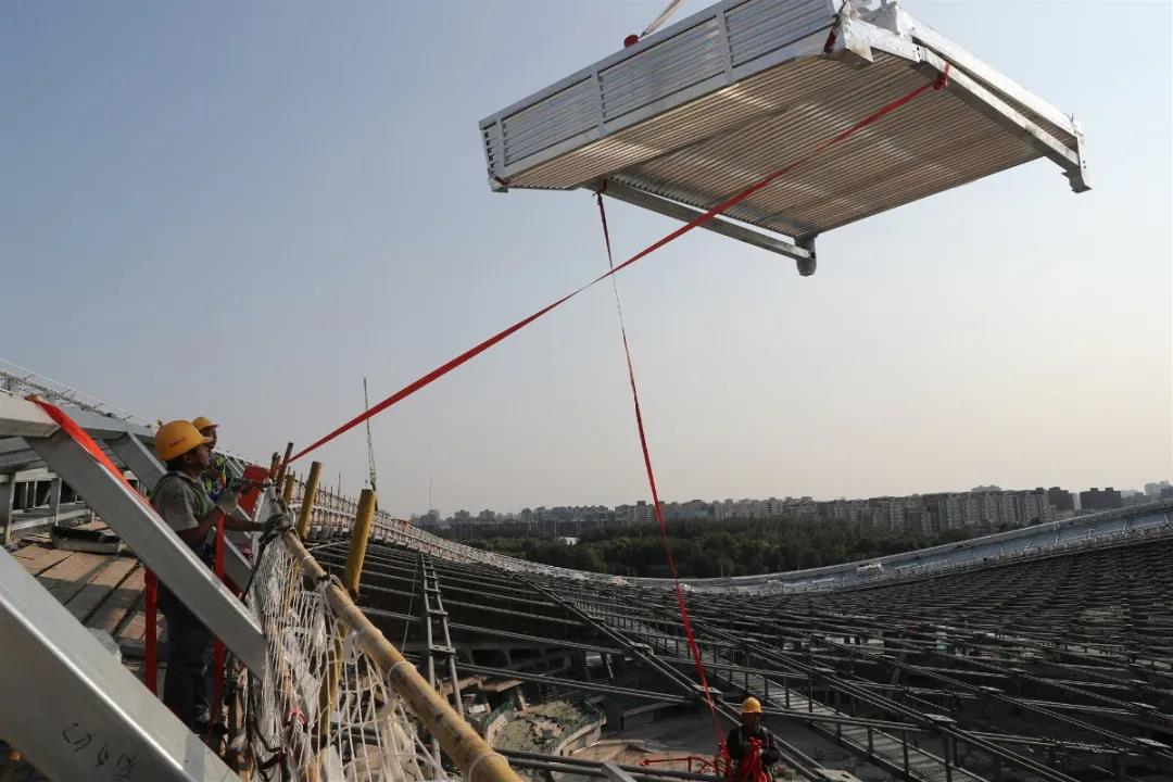 建设者通过49对承重索和30对稳定索编织成长跨198米、短跨124米的索网状屋面,再铺设1080块4×4米单元屋面板组装而成。由于索网屋面的空间形态非常复杂,张拉以后每一个“方格”空间形态都不一样,因此填充的每一块单元体尺寸也不同,需要通过实测得到数据后再进行加工定制。
