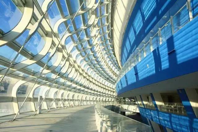 这种创新型“冰丝带”状曲面玻璃幕墙的设计灵感来自冰雪运动与速度的结合。盘旋的“冰丝带”象征着速度滑冰运动员高速滑进时冰刀留下的轨迹,22条“冰丝带”又象征着在2022年举办北京冬奥会。