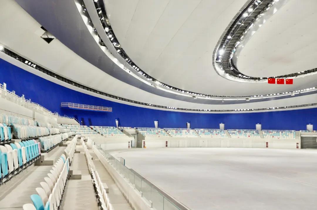 国家速滑馆采用了全冰面设计,冰面面积1.2万平方米,是目前亚洲最大冰面,也是全世界最大的采用二氧化碳跨临界直冷制冷系统的冰面、全球首个采用二氧化碳跨临界制冷的冬奥场馆。这项技术是目前世界上最环保的制冰技术,碳排放趋近于零,同时也是最先进的制冰技术,冰面温差可控制在0.5度以内。这样制冷不仅比传统方式效能提升20%以上,且制冷均匀,不会出现各部位温度不同的情况,特别是在以0.001秒计时的高水平竞技中,这些都是关键性的因素。同时,国家速滑馆将制冷产生的余热用于运动员生活热水、融冰池融冰、冰面维护浇冰等,一年可节省约200万度电。
