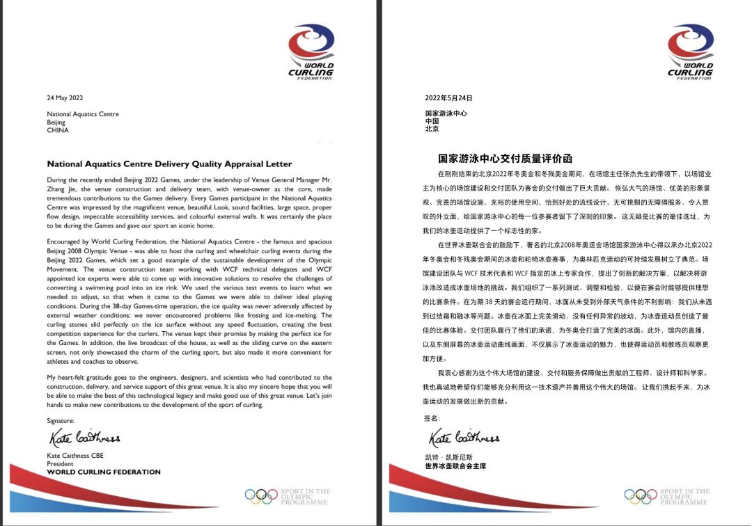5月24日,国家游泳中心收到世界冰壶联合会主席凯特•凯斯尼斯发来《国家游泳中心交付质量评价函》,高度评价了国家游泳中心在冬奥会和冬残奥会期间赛事交付质量,肯定了场馆为国际奥林匹克运动树立的典范作用,并对所有为场馆建设、交付和服务保障做出突出贡献的冬奥人表示感谢。