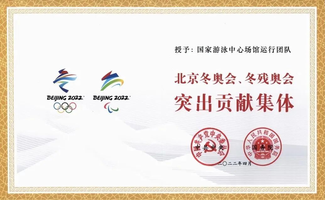 2022年4月8日的北京冬奥会冬残奥会总结表彰大会上,党中央、国务院授予国家游泳中心场馆运行团队“北京冬奥会、冬残奥会突出贡献集体”荣誉称号,这是所有参与“冰立方”设计、改造和赛事服务保障人员的最高荣耀。