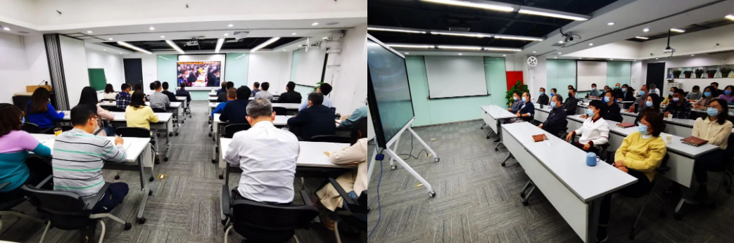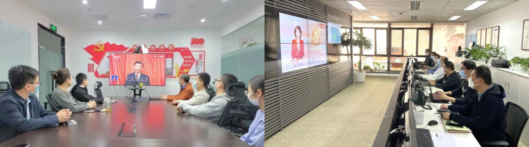 国家速滑馆党委组织各党支部和全体党员以线上线下相结合的形式收看了大会盛况。同时,组织当日在班员工、各运维方集中在公司会议室共同收看学习。
