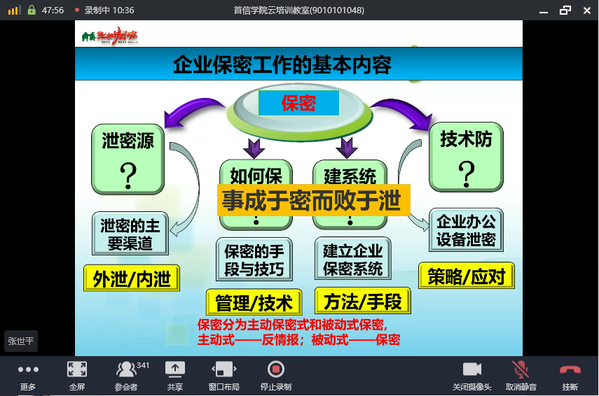 本次培训邀请国内知名竞争情报、反情报和管理专家,中国竞争情报实战派首要代表,被誉为中国“商业007”的张世平教授,围绕企业秘密的保护与保密工作操作方法,重点讲解了企业泄密的主要途径和窃密的主要手段、商业泄密的保护与防范措施。