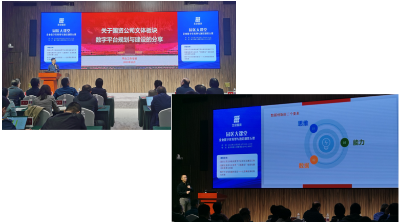 本次培训仍以内部分享交流为主,分享了国资公司数字化转型的三个实际案例。国资公司文体板块数字平台建设工作专班的两位成员:国资公司文体产业投资部高级项目经理郑翼程、首信公司大数据中心总经理万聪以“关于国资公司文体板块数字平台规划与建设的分享”为主题,介绍了文体板块落实公司“数字化营销、集团化作战、品牌化运作”的理念和要求,推进文体板块数字平台建设的必要性、搭建构想及工作进展。