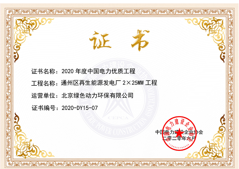 通州项目电力优质工程奖获奖证书