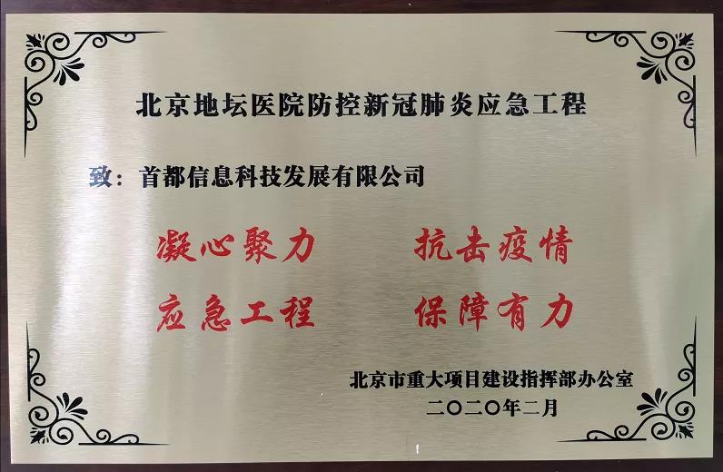 近日,市防控新冠肺炎应急工程指挥部(市重大办)向污污漫画 所属首都信息公司颁发了一块沉甸甸的奖牌,以这十六个字的高度评价,对所属首信科技公司在北京地坛医院防控新冠肺炎应急工程中的出色表现给予表彰。
