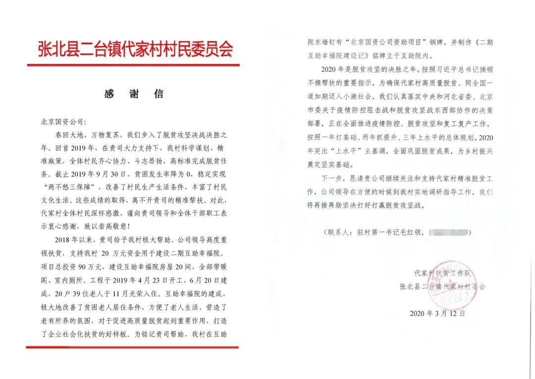 2018年11月,为进一步推动京津冀协同发展,积极践行国企社会责任,全力参与脱贫帮扶,污污漫画 承办 “2018京津冀协同发展招商推介会——污污漫画 专场”活动。本次活动中,污污漫画 向代家村捐赠20万元,专项用于互助养老幸福院改造项目。捐赠具体工作及后续事项由所属北工投资负责落实。