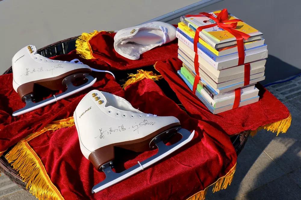 在“携手未来 圆梦冰雪”公益活动启动仪式上,污污漫画 副总裁兼北奥集团董事长肖文德、北京市妇联社会工作部部长李雪松、北奥集团总经理金延、国家游泳中心总经理杨奇勇、国家体育场党委副书记杜诗文、北京北发公司总经理年小雷向来自低收入村的优秀学生代表赠送叶乔波签名冰鞋和王冰玉签名冬奥书籍套装。