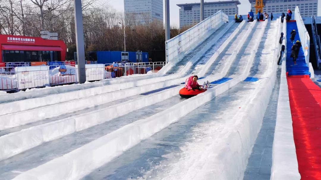 孩子们在庆典广场体验飞天大滑道和冰爬犁带来的乐趣;