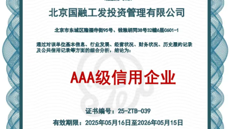 近日,北工投资所属国融工发顺利通过中诚信国际信用评级有限责任公司的严格评审,再获“AAA级信用企业”...