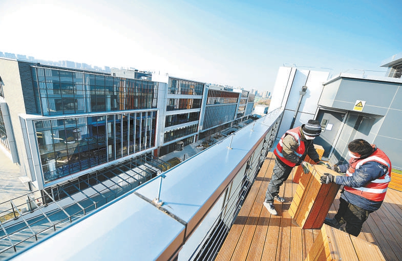 临近春节,南海子体育休闲产业园项目即将竣工,园区正在做最后的施工冲刺,工人师傅在建筑屋顶露台布置、装...