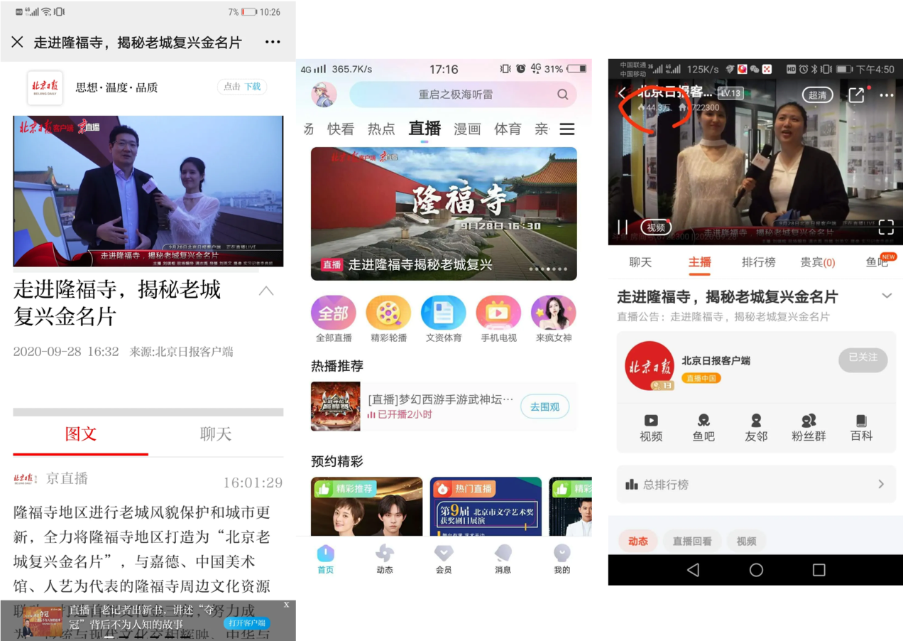 此次直播在北京日报客户端京直播,北京日报及北京晚报微博直播,北京日报旗下的头条、百家号、抖音直播、快手直播、斗鱼直播,以及联合新浪新闻客户端、优酷、长安街知事微博、北京日报百家号、都市现场微博、中搜搜悦、YY直播、KK直播等十余个视频直播平台播出,截至目前,总播放量已超过215万次。直播内容全程“高能”,收获大批网友的关注和点赞。