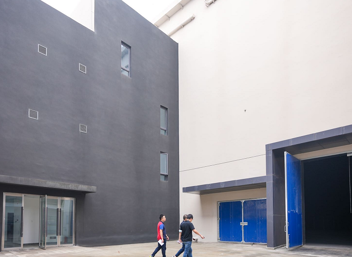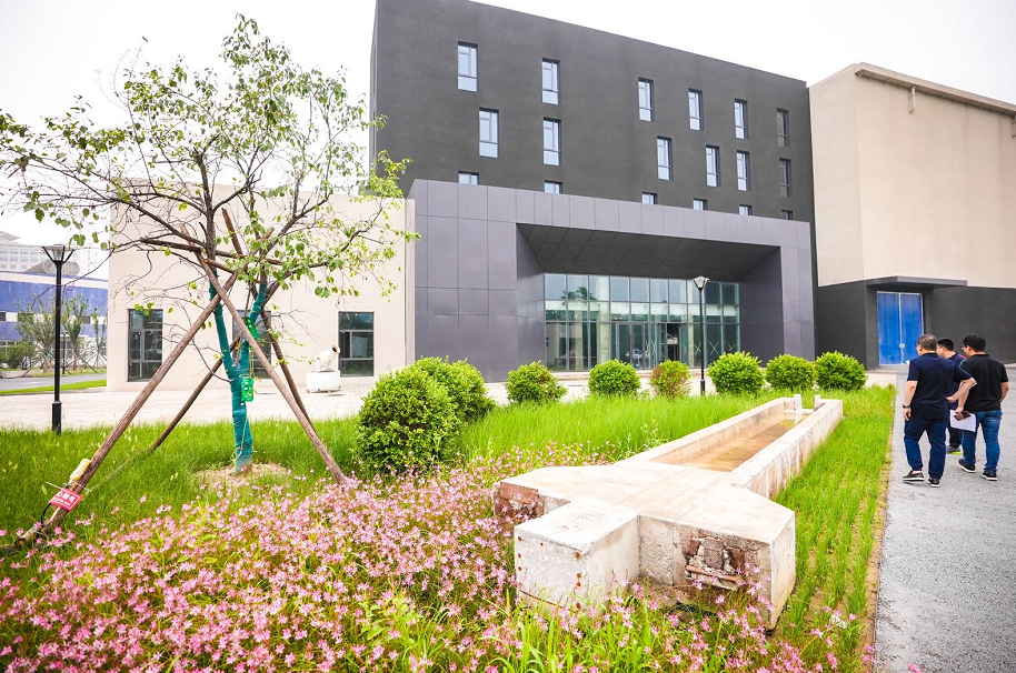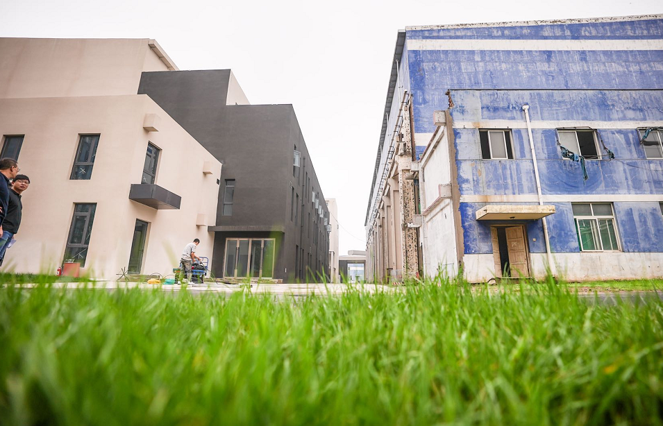 经过景观绿化,曾经的工业老厂区如今草木葱茏,充满生机活力。经过大半年的改造,靠近大门口的一栋老厂房已经变成浅黑、米白色调的现代化办公楼,与另一栋即将改造的蓝白色调的老厂房形成强烈对比。
