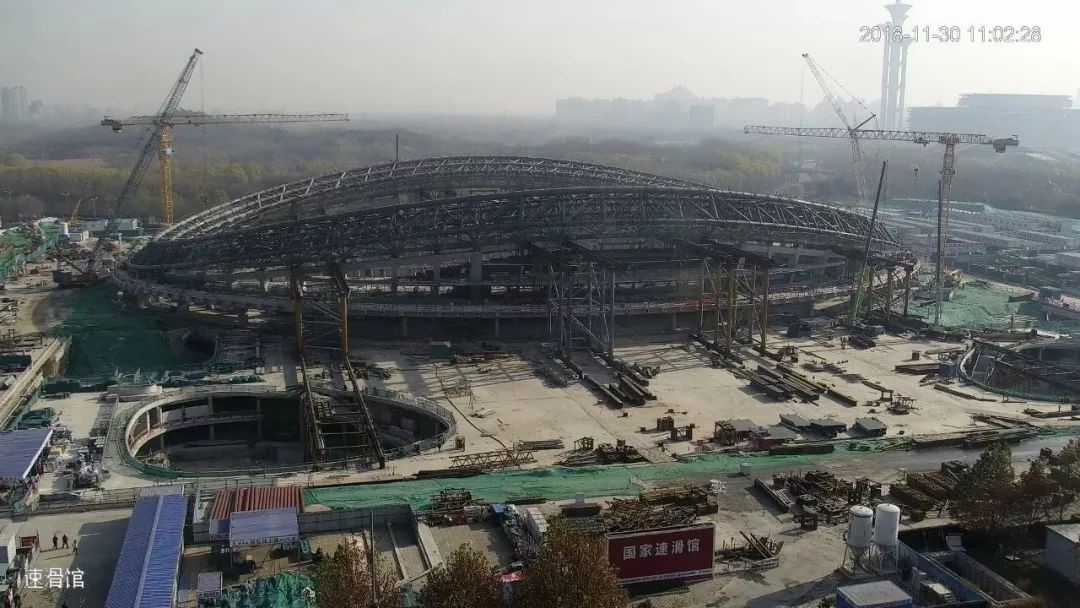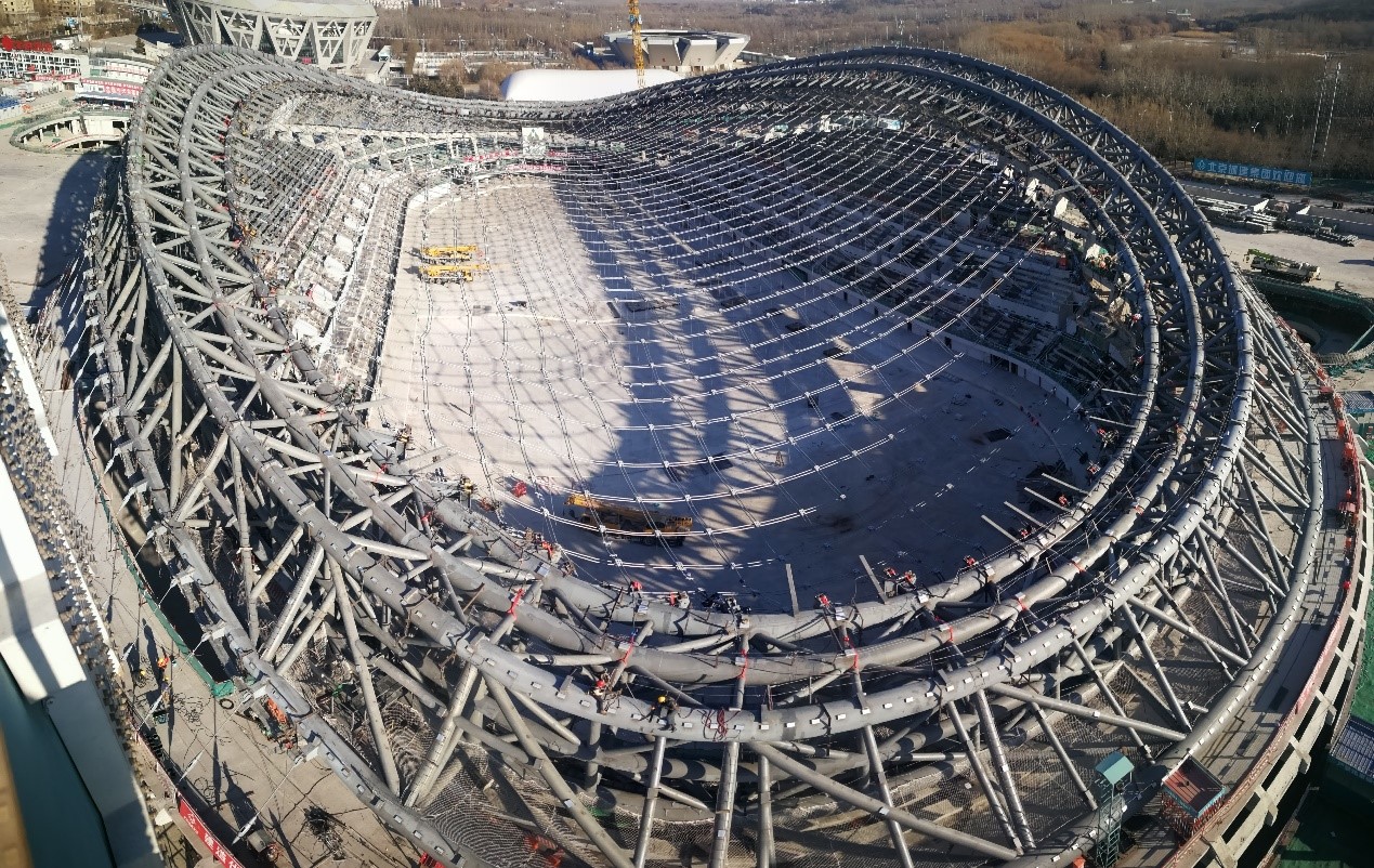 11月30日,国家速滑馆马鞍形屋面环桁架最后一根主弦杆吊装到位,标志着该工程屋面钢结构安装全部完成。