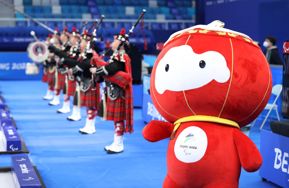 在国家游泳中心“冰立方”,“雪容融”在轮椅冰壶循环赛前参与表演。新华社记者杜潇逸摄