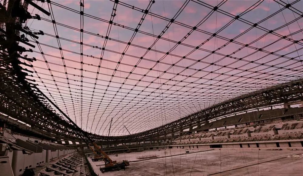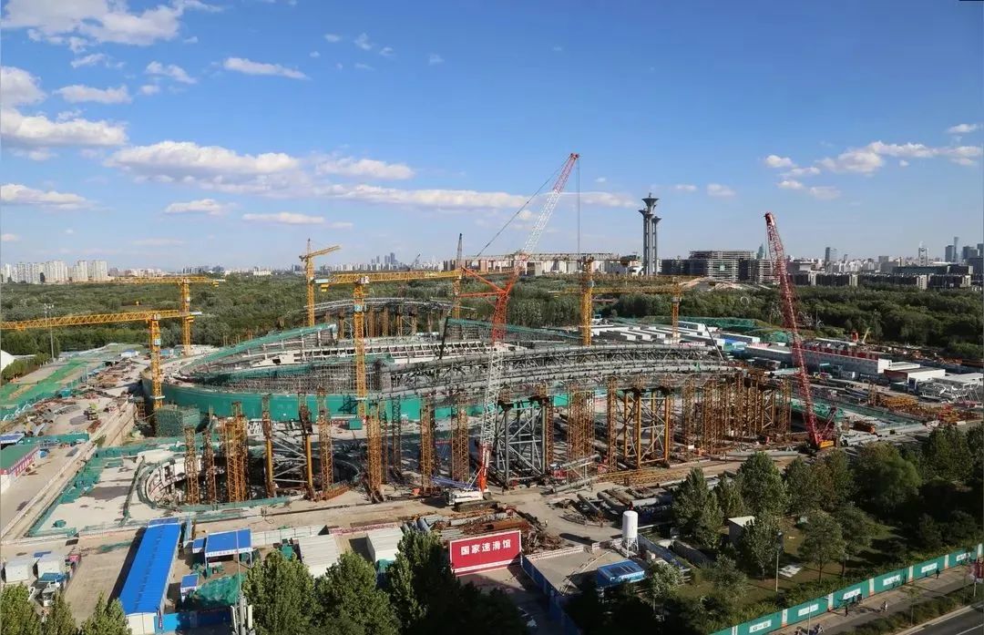 在施工过程中,国家速滑馆建设团队通过自主技术创新,采用钢结构环桁架“南北分区直接吊装+东西两侧滑移安装”的施工方法。东西两侧环桁架滑移首创国内先地面滑移后高空滑移的分段式滑移技术,实现了高效、高精度施工。同时,国家速滑馆所采用的看台板为国内首例弧线清水混凝土看台板,预制看台构件虽然尺寸多样、弧度多变,但却严丝合缝地拼装成为一个宏大的看台。仅用8个月,2018年9月30日,主体结构就“拔地而起”,创造出令人惊叹的“中国速度”。
